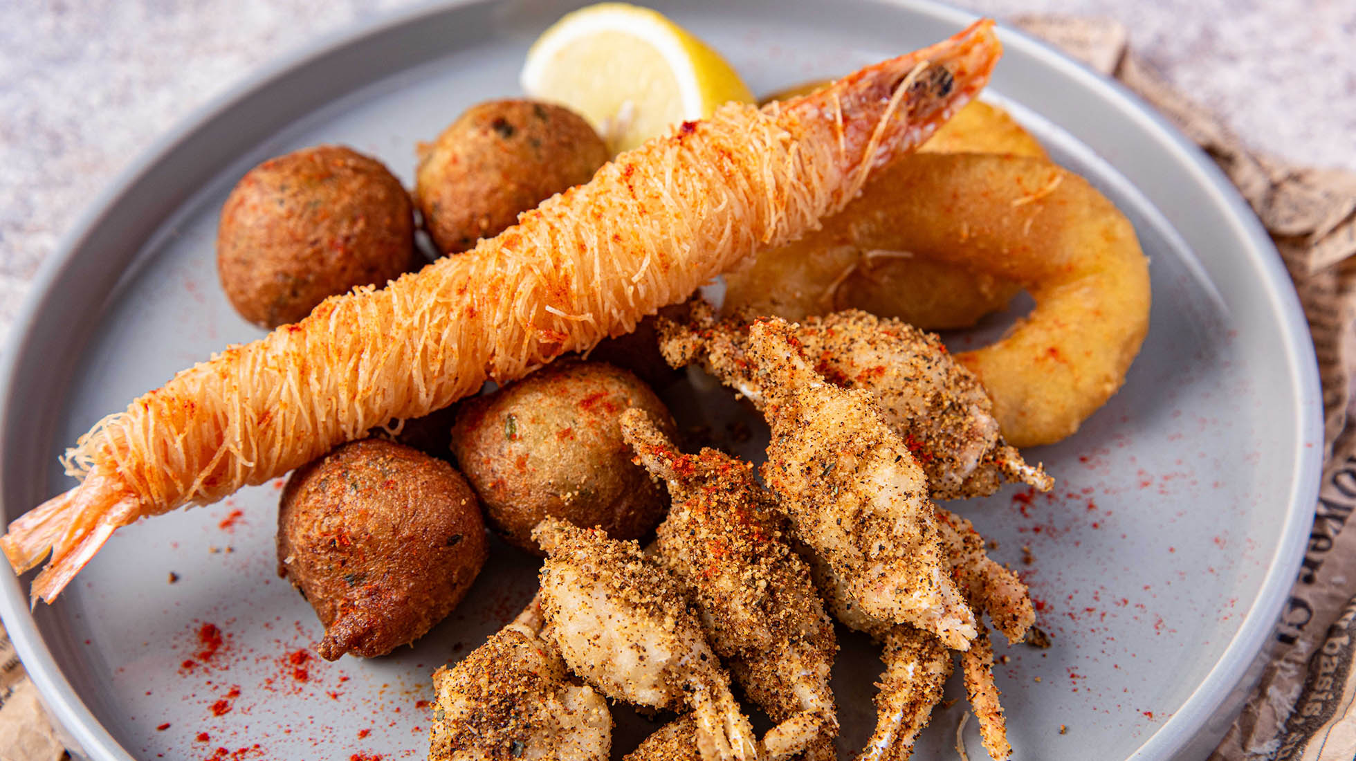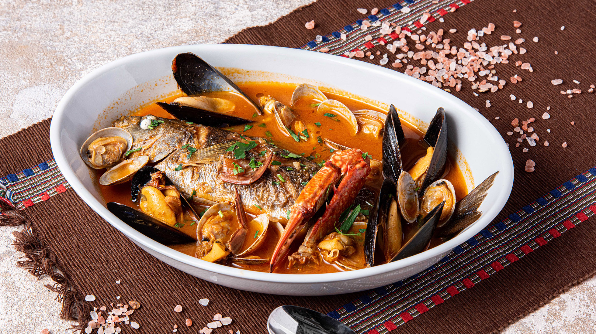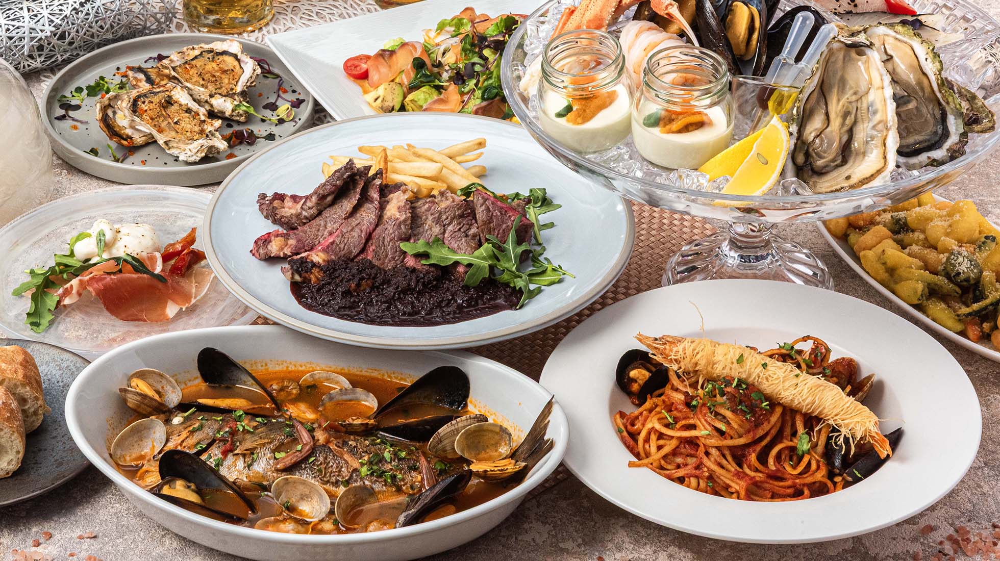 海風を感じるオーシャンビューのテラス席を備え、上品な店内装飾とこだわりの照明が彩る店内で、シーフードやグリル料理などの地中海料理をご堪能いただけます。 大きなチーズの器で仕上げる『濃厚チーズパスタ』や、芳醇な香りが広がる瞬間燻製など、目の前で料理が完成するライブ感あふれる演出をお楽しみください。