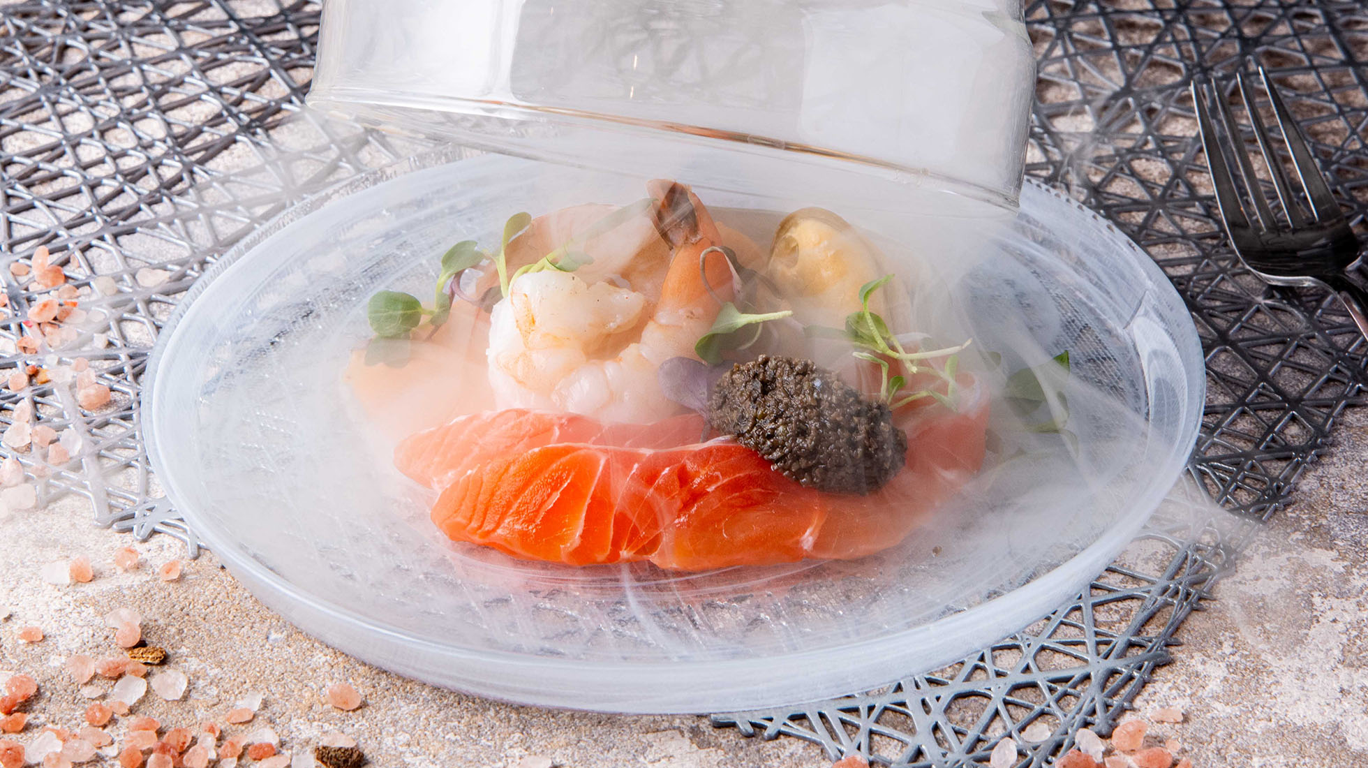 ライブ演出02|瞬間燻製 魚介の前菜3種盛り合わせ