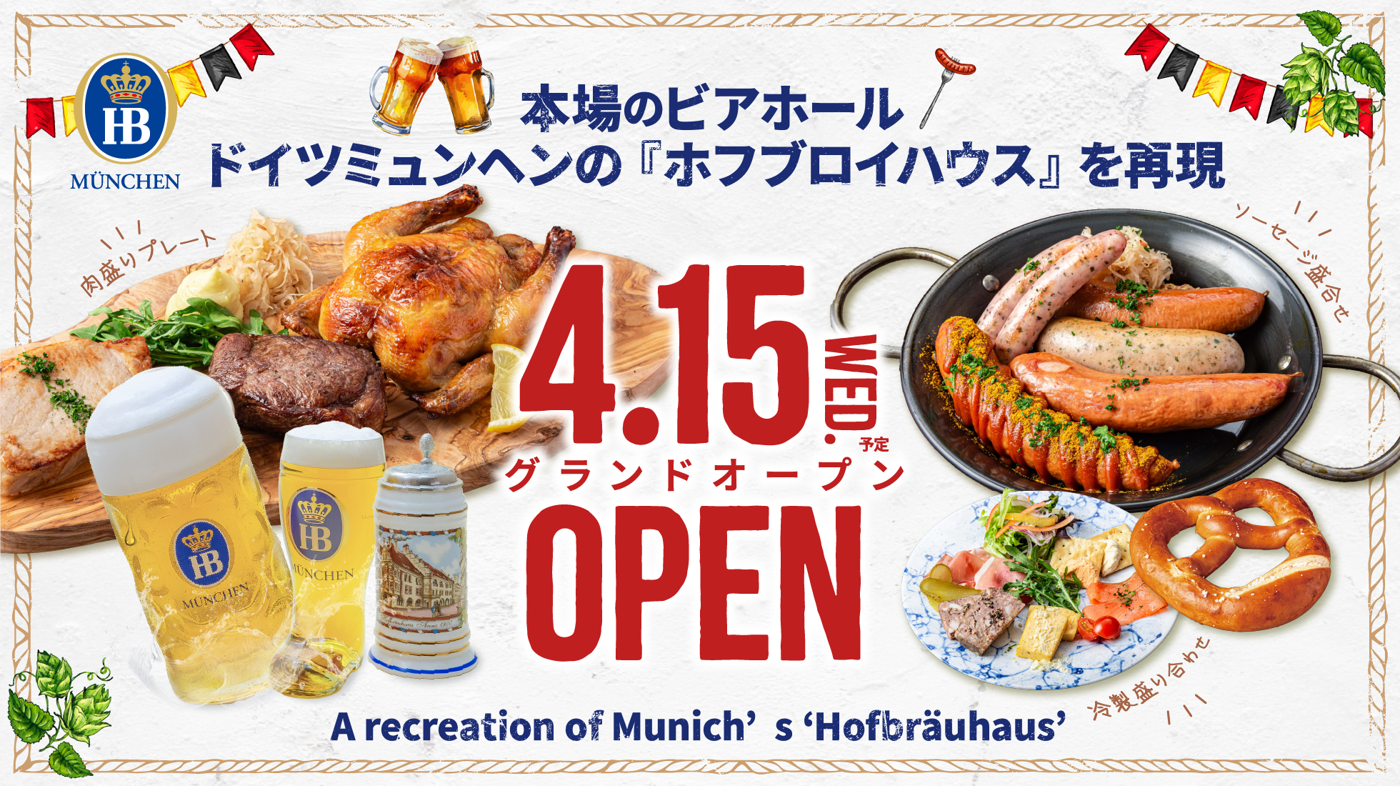 本店舗は、ドイツ・ミュンヘンに本拠を置くバイエルン州立醸造所 ホフブロイ社公認、かつオフィシャルインポーター直営の本格ドイツビアホールです。世界的に広く知られるドイツビールブランド「ホフブロイ」の魅力を、現地さながらのスタイルでお楽しみいただけます。